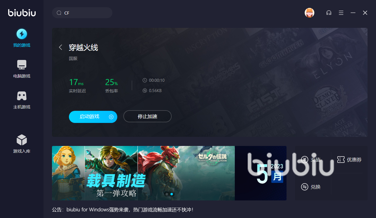 2023年05月23日 19:07 来源:荆棘思大甲穿越火线这几个月的热度可谓是直线飙升,因为它对电脑配置要求很低,让许多电脑配置不高的人也能体验到热门游戏的乐趣,可许多人还是反映玩cf电脑卡顿怎么办?要是确定电脑性能没问题的话,多半可能是因为网络延迟的问题,虽然是作为国服游戏,可FPS游戏对枪除了看枪法之外还要看网络状况,网络延迟越低开枪速度就越快,要是游戏中出现网络延迟卡顿等问题可以开启biubiu加速器。