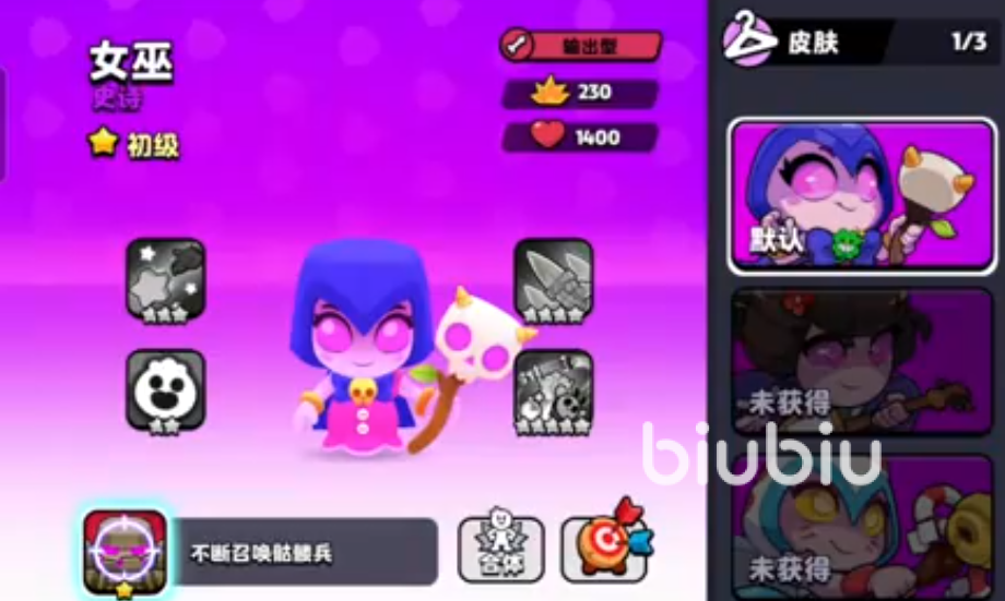 该角色擅长使用巫术球来远距离攻击对手,同时还能召唤骷髅小兵协同作战,是一名高输出的远程英雄,实力不容小觑。第一个技能效果可不断的将骷髅兵召唤出来,每7秒能召唤2个骷髅兵,角色合体后可召唤4个;她召唤的骷髅兵拥有225点的血量,每次攻击敌方可造成13点伤害。2技能可召唤更多的骷髅兵,每7秒能召唤3个,合理后翻倍为6个。并且提供1个骷髅飞桶法术,这个法术会对敌方单位打出30点落地伤害,骷髅兵的骨头会变得更硬,而且手持锋利匕首攻击敌人,它们的血量也增加到350点,伤害提高到25点。她召唤的骷髅还能给小队提供一定的抗伤效果。
