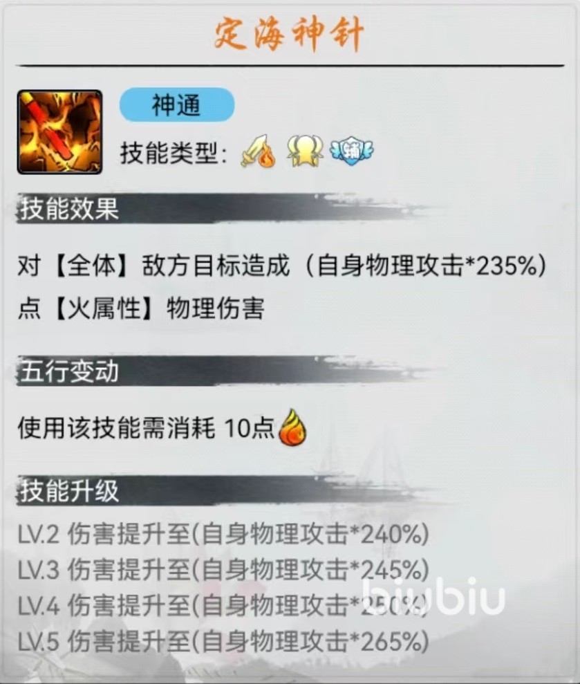 斗战胜佛属于火系最顶级的仙友之一。普通招式火眼金睛对敌方单体目标造成火属性伤害后有几率为其施加破甲状态被破,甲所影响的目标降低,物理和防御双重属性持续两个回合。降低防御属性之后,后续可以造成的伤害更加可观,除了自己,队友也能够享受到破甲带来的加成,神通招式定海神针,直接对全体敌方目标造成一次高额,物理打击非常纯粹的输出伤害技能不带任何效果。但是能够为团队带来强大的输出。