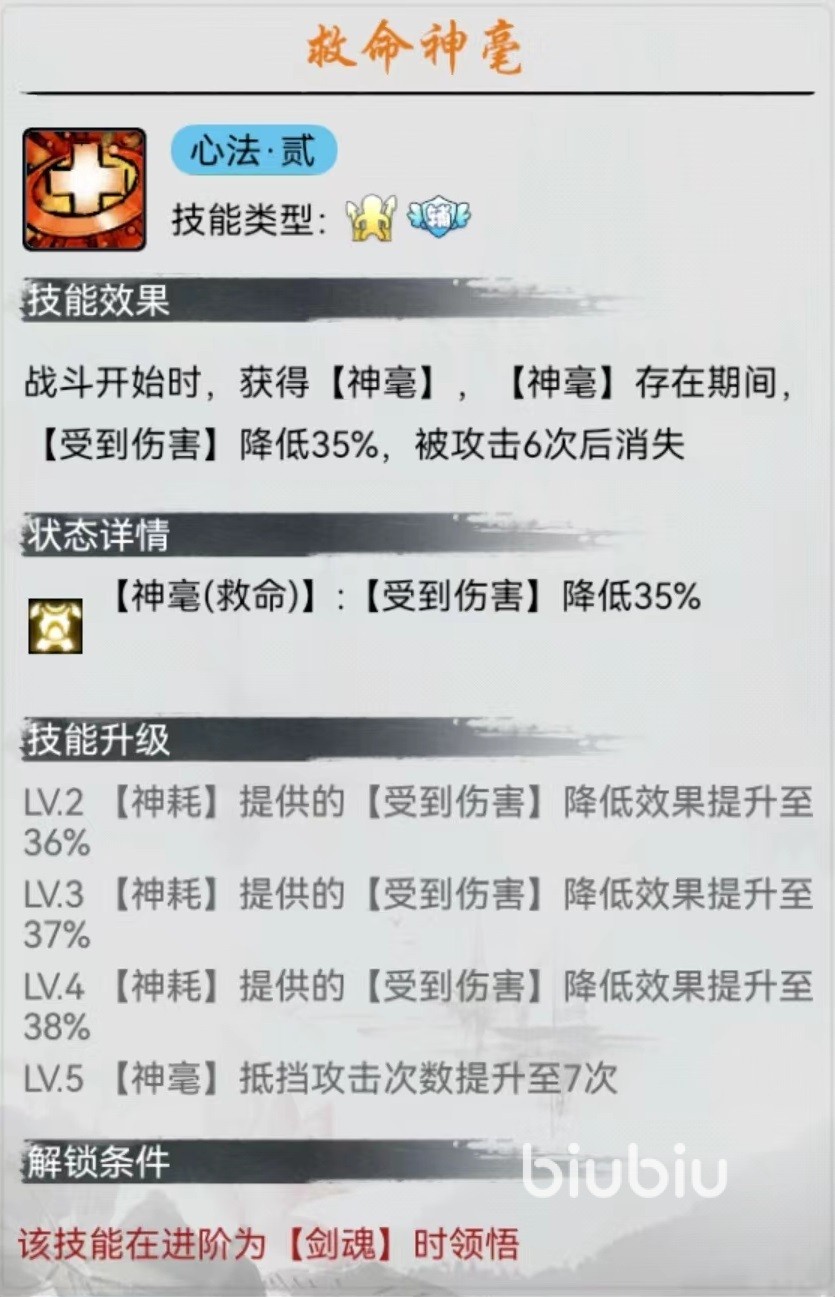 在自身两个心法的加持下可以获得力道提升,以及在战斗开始时得到神毫效果,在神毫存在期间,斗战胜佛受到的伤害降低,并且此效果不能被驱散,在抵挡6次攻击后自动消失。这样在前期几乎不会受到太多伤害,保证了生存性可以有更好的输出空间。