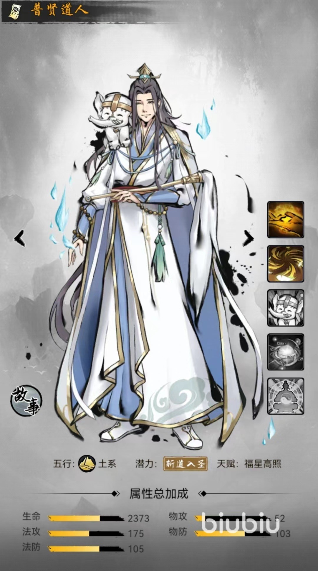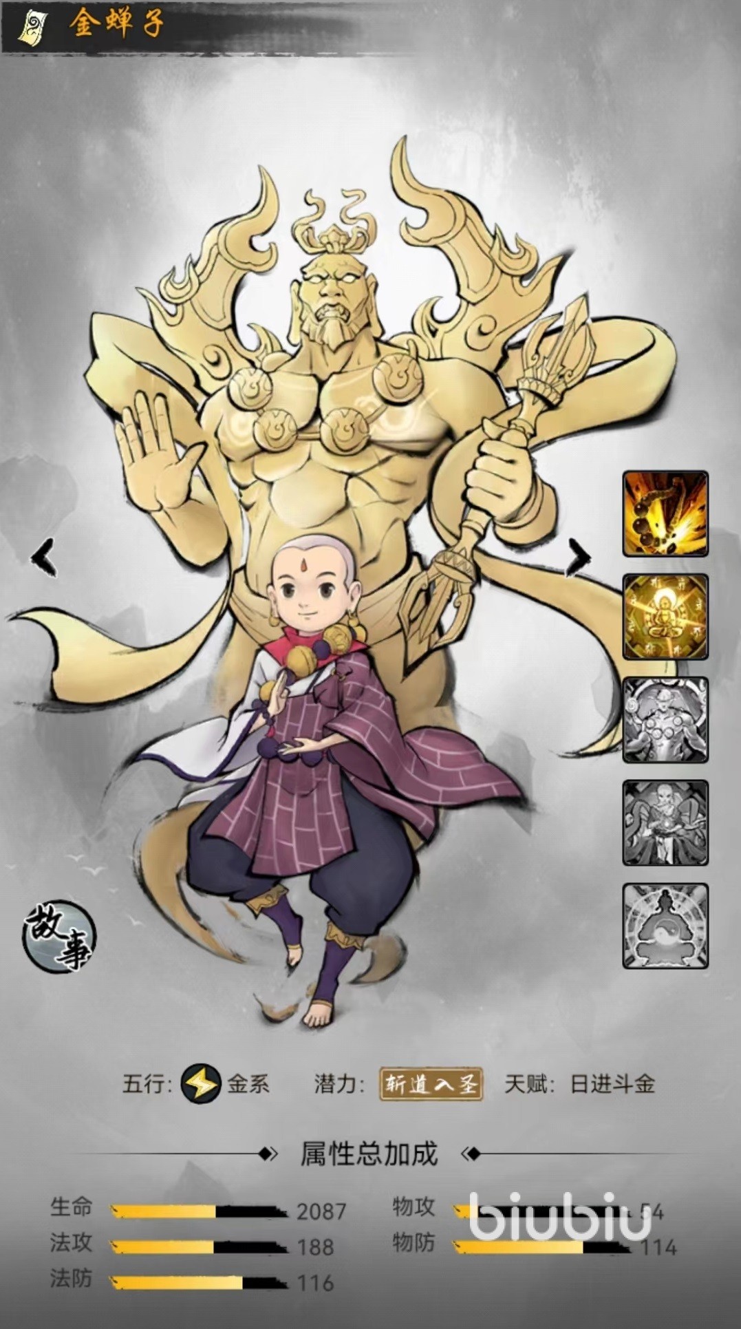 在队伍搭配方面因为本身输出足够高,所以可以选择一些辅助性比较强的组成阵容。除了主角自身之外还有三个位置可以选,小编推荐的是金系金蝉子,木系二郎真君,土系普贤道人。金蝉子普通招式慈悲为怀为血量最低的友方单位恢复生命,值神通招式往生咒为两个目标添加往生效果,持续两个回合如果在这一时间段内被击杀,那么则有很高的几率复活起来,重新加入到战斗中。