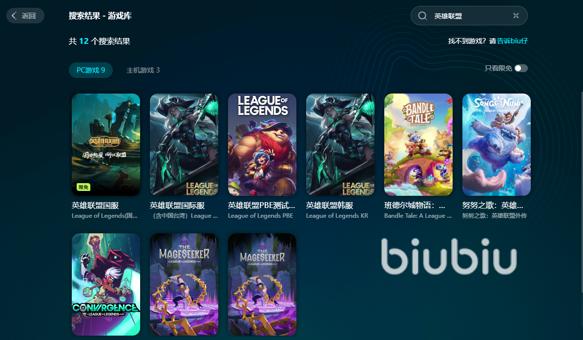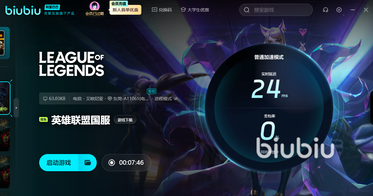 用比较热门的英雄联盟举例子,我们可以看到这个游戏在biubiu这里是享受很多的加速服务的,国际服,国服等等都有,大家想玩哪个,就选择哪个,切记不要点错了,不然加速效果就大打折扣了。