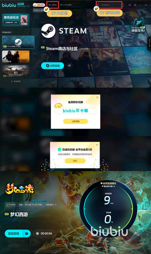 biubiu为了新用户快速了解平台,现在赠送免费加速时长。首先,新用户第一次进入账号,直接送一天时长。新用户不要浪费这一次机会,真实感受一下biubiu提速效果。其次,用户通过biubiu不卡顿兑换码额外增加三天免费时长。大家在软件搜索框输入兑换码,轻松领取免费加速时间。第三,限时免费加速。biubiu设立了专区,大部分的国内端游、主机游戏等都免费加速。