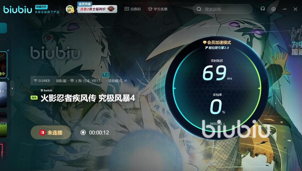你能在这个游戏内,与其他玩家进行1v1的实时对战,期间你可以使用各种招式去攻击对手,过程中还要灵活地躲避敌人的技能,寻找合适的时机去击败它,游玩时突然闪退的话,就会使你输掉比赛,错失快要到手的奖励,想要避免此类情况发生,使用biubiu这个软件是个不错的选择,内置的帕拉斯引擎,会为你搭配一条高速的网络通道,让对局能流畅地进行下去。不过,平台目前仅支持给火影忍者疾风传究极风暴4加速,剩下的几代作品之后会进行补充。要是你正好在玩第四代,不妨试试biubiu内的专线优化功能,现在作为新用户,还能领取3小时的免费试用时间,此外,平台还下发了一批兑换码【biubiu不卡顿】,无论新老用户,只要输入了这个码,即可得到三天的试用时长,接着就能好好地体验应用内的各项功能了。