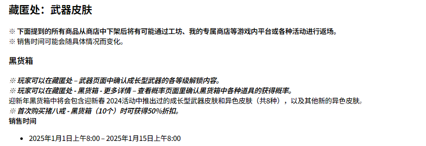 另外游戏里面还有各种豪礼上线哦,我们可以在藏匿处看到各种商品,有成长型武器可以获得,并且还可以通过开黑货箱得到各种皮肤等道具,如果是首次购买猪八戒黑货箱,更是可以得到50%的折扣。这个销售时间是1月1日8:00到1月15日8:00,大家要抓紧时间去获取这些道具哦。