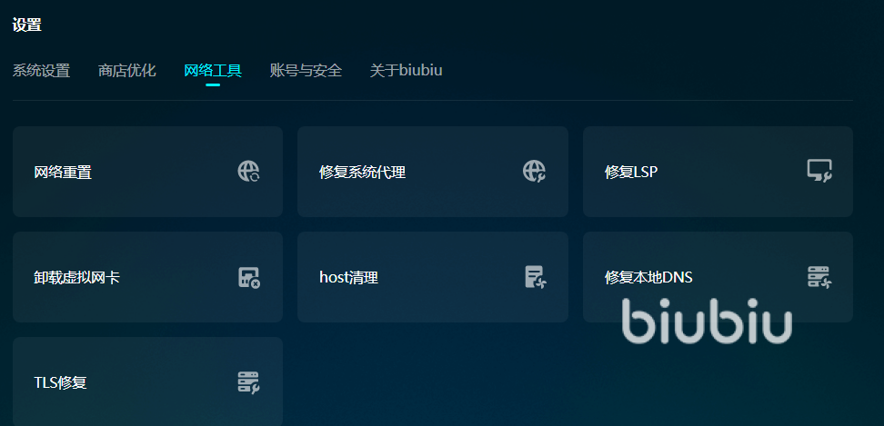 biubiu还提供电脑修复优化功能,当电脑出现故障的时候,大家可以进入工具箱选择对应的工具来解决,使用方法很简单,只要一键修复,等待系统自动在后台优化,修复完成以后就能活着焕然一新的电脑环境了,用起来给力极了。