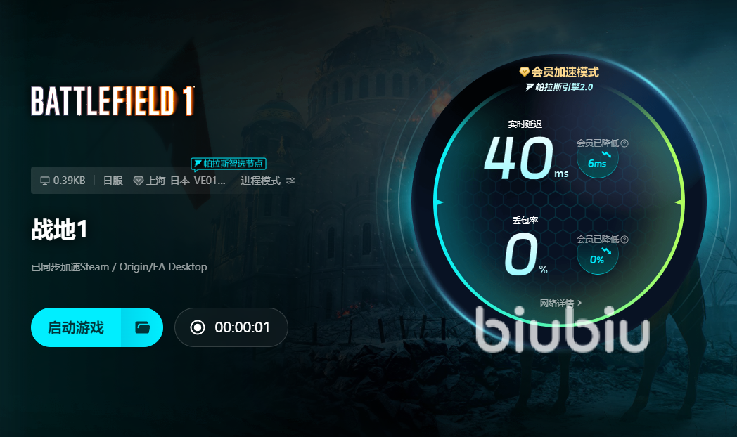 在主界面中搜索《战地1》,点击“立即加速”按钮,biubiu能够根据当前的网络情况、服务器链接稳定性、节点距离、节点质量自动选择最好的路线。在开启之后都可以查看自己的网络状态,确保游戏的顺畅运行。无论你是新手还是老玩家,都能轻松上手,享受到流畅的游戏体验。通过会员加速器模式可以尽情体验各种游戏的网络优化提速。