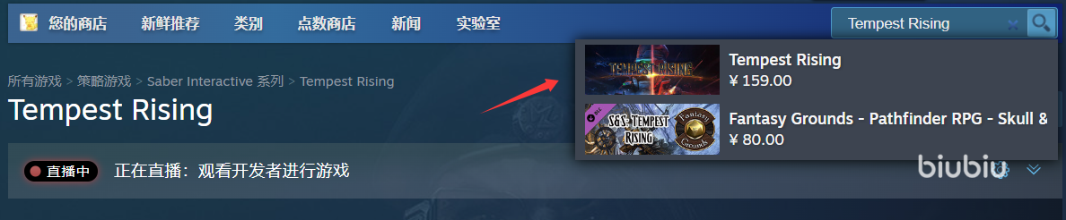 《风暴崛起》在steam上叫做《Tempest Rising》,想要找到这款游戏,记得一定要复制这个英文名,然后粘贴在steam页面右上角搜索栏中,等上一两秒就会显示这款游戏的预览了。