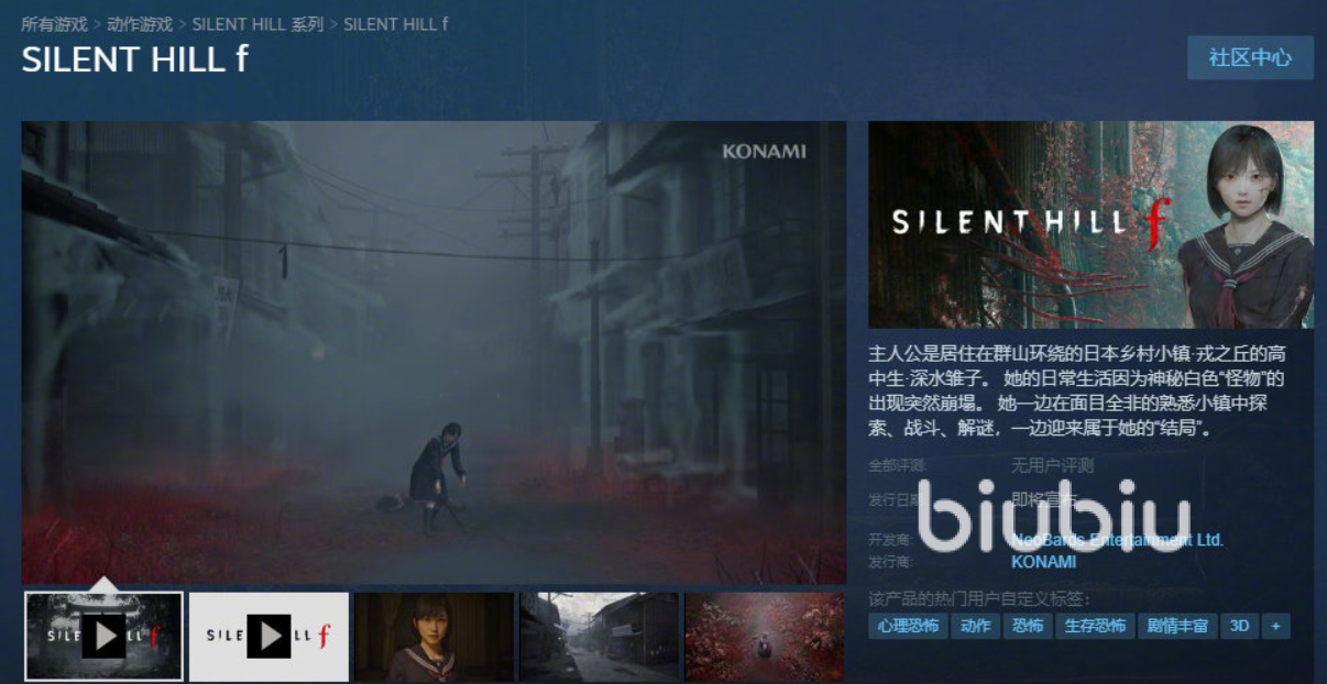 目前,《寂静岭F》的Steam预约页面已经正式上线,输入它的名称“SILEN THILL f”,就能精准搜到该作品。需要注意的是,当前仍处于预约期,暂未正式发售。不过,玩家可以先点击页面上醒目的“加入愿望单”按钮,当游戏正式上线时,玩家将会收到邮件通知,从而第一时间购买游戏,抢先开启这场恐怖冒险之旅。