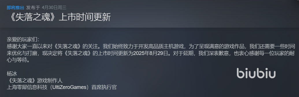 《失落之魂》原定于2025年5月30日全球同步登陆PS5与PC平台(Steam/Epic)。不过目前官方已经发布公告宣布跳票,发售时间重新定为2025年8月29日。