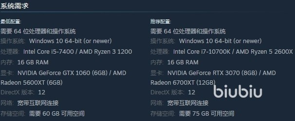 游戏的最低配置要求如下:操作系统需为64位的Windows 10,处理器英特尔 Core i5-7400或AMD 1200,内存至少需要16GB,这是目前大多数大型游戏的标准配置。显卡最低N卡的1060,并且必须支持DirectX 12。此外,游戏需要至少60GB的可用存储空间,建议留出更大的空间以便于游戏本体及后续更新内容的安装。