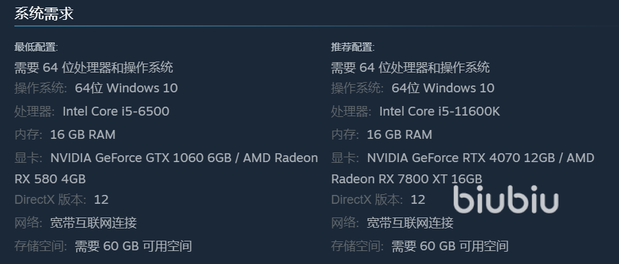 要运行立方救赎并保证基本可玩性,电脑最低需要Windows 10操作系统,配备英特尔 Core i5-6500处理器和16GB内存。显卡方面,最低要求为AMD Radeon RX 580(4GB显存)。此外,请确保有至少60GB的硬盘空间,连接宽带网络,支持DirectX 12,以便在主流画质设置下实现接近30帧每秒的稳定帧率。