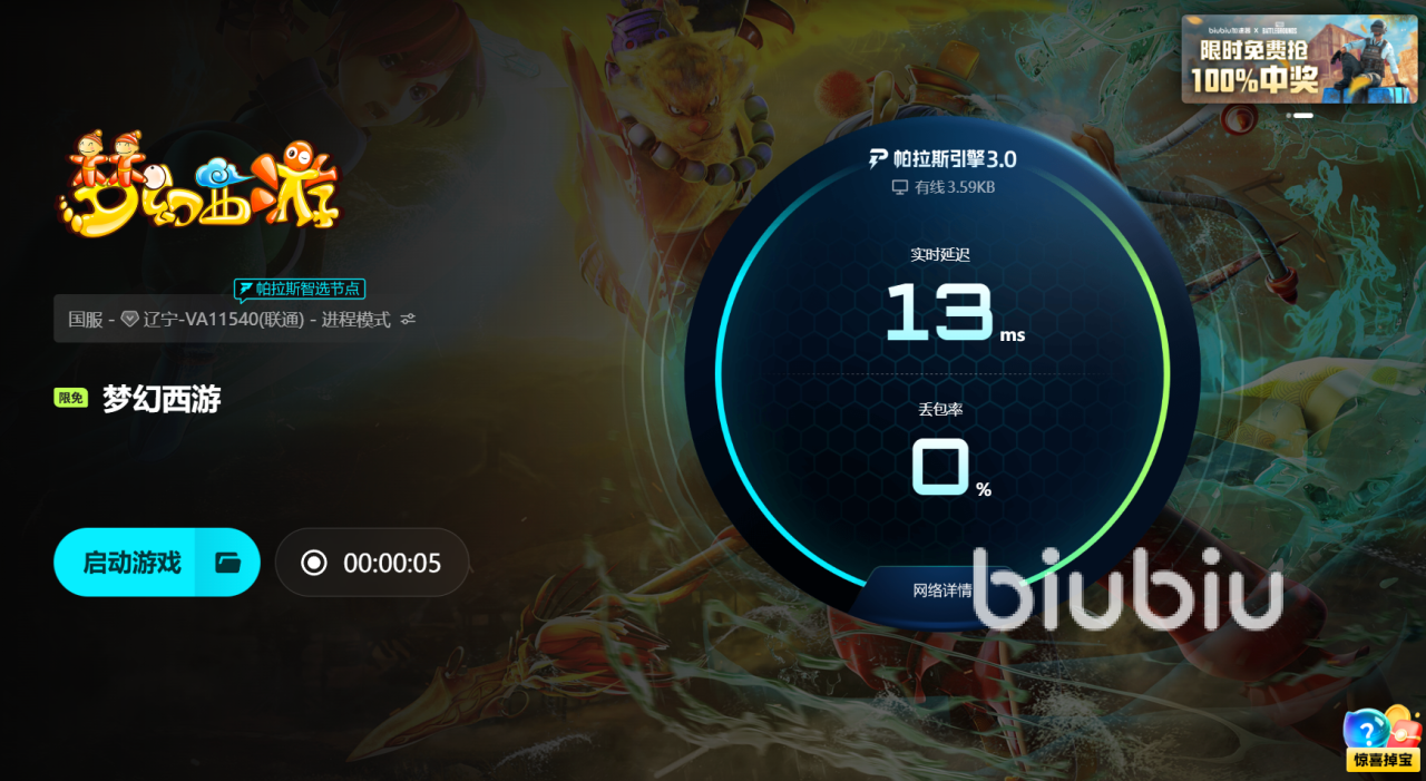 操作上也很简单。打开biubiu客户端,选择梦幻西游专用加速即可。系统会自动完成线路匹配与优化,不需要手动设置。后台占用极低,不会拖慢CPU或影响游戏帧率。加速完成后重新登录游戏,连接更快,加载地图和切换场景都更顺畅。即使长时间挂机任务或多人组队副本,也能保持稳定。