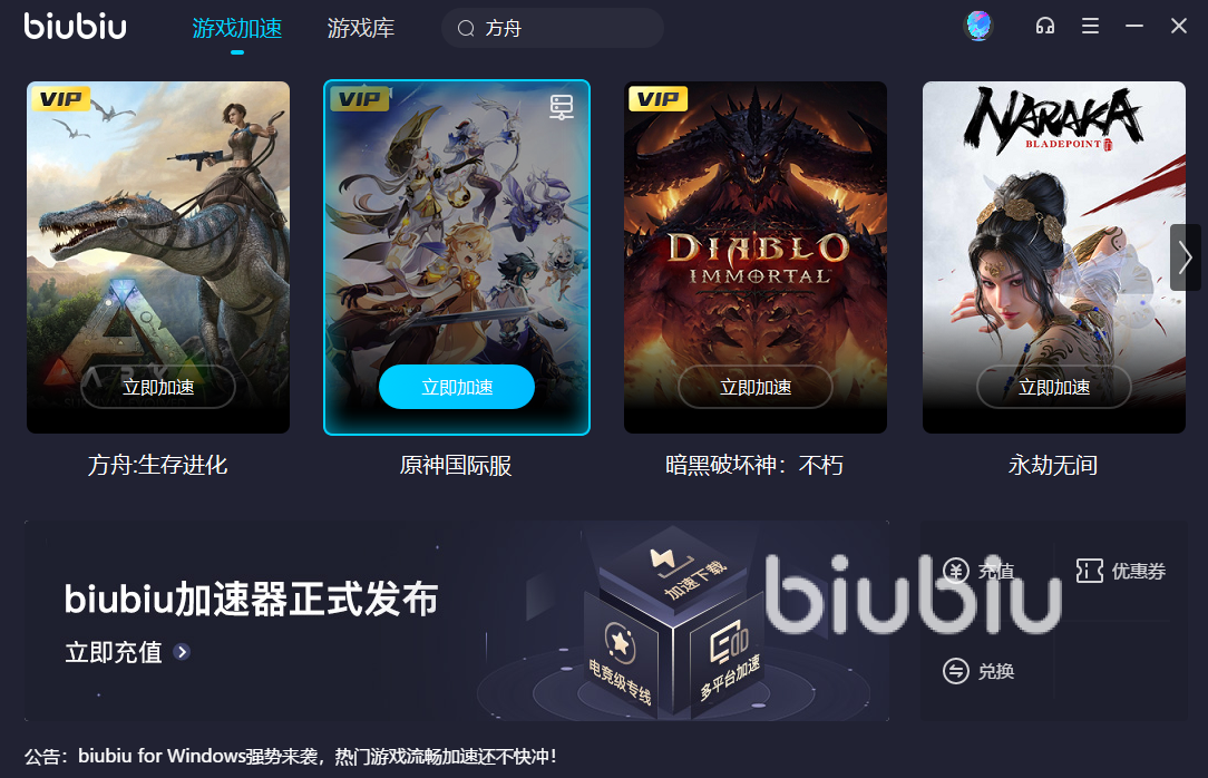 2022年07月19日 22:31 来源:澈方舟生存进化是一款拥有着超高清画质,并且能够给用户们带来极强的野外生存的体验的游戏。关于方舟生存进化加速器免费下载2022年推荐哪个,目前国内的好用加速器可以用来加速该游戏的具体哪个值得下载,在这里小编推荐给大家biubiu加速器。