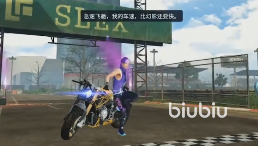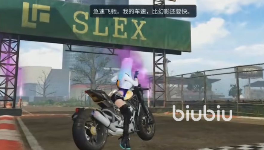 亮点比较集中在紫蓝色的渐变长发上,在整体飒爽炫酷的风格下增加了妩媚感,既突显了女子的风情又有了赛车手的职业特性。其中搭配充满了未来感觉的镭射短吊带上衣和黑色热辣皮裤,以及漆黑的高跟长靴,御姐气质拉满。当然少不了专属动作,高抬腿跨过机车作为,翻身上车,向观众热情飞吻,既性感又自信。