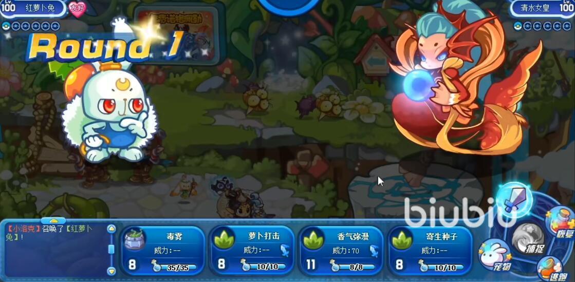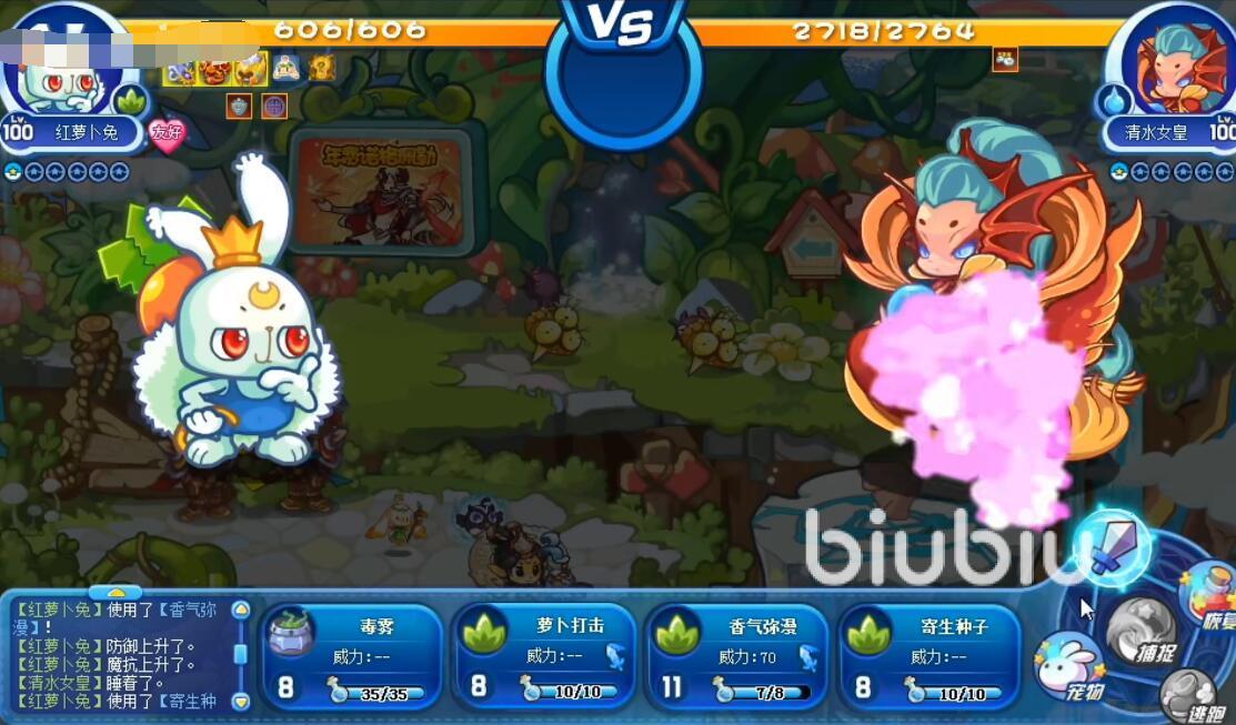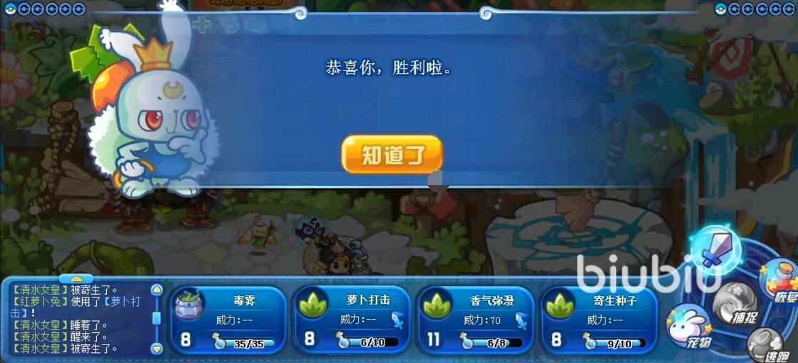 想要击败清水女皇的话,小编优先建议玩家们培养一个100级的萝卜兔,该宠物的战斗技能将在游戏当中发挥出强大的优势,并帮助各位快速的击败对手。在进入了战斗的第一个回合,玩家们就需要首先使用毒素技能发动攻击,该技能会让清水女皇连续进入三个回合的负面状态并持续丢失生命值。