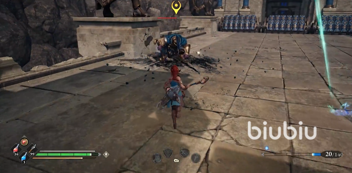 随后,敌人的生命值受到了损失,玩家们就会发现大剑守卫的移动速度变慢了许多,这个时候就可以快速移动到身边进行攻击,一旦对方进行反击的时候,控制角色闪避到一旁就可以顺利的躲开。玩家们还可以配合法杖的技能来攻击,利用震荡波让大剑守卫直接倒地无法动弹。