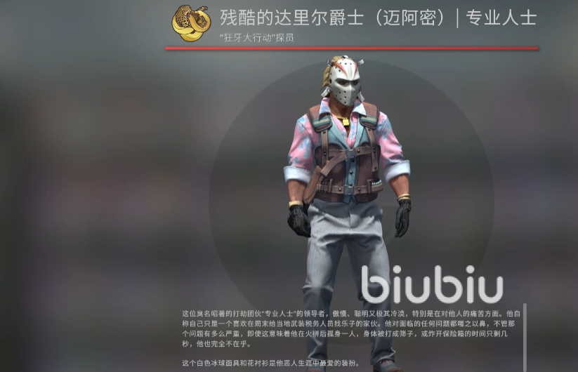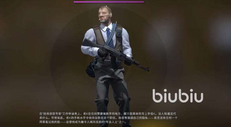 最后给大家介绍的是老K,T阵营,狂牙大行动探员,穿着蓝色衬衫,打着领带,不要被他的外表蒙骗,因为他不是一个上班族,他头上还套着丝袜,不太想让人认出他来,是一个西装暴徒。游戏虽然还未上线,但是作为一个大型的FPS游戏,下载肯定是要花很多时间的,大家可以在游戏上线后使用biubiu加速器进行下载提速,500%下载速度的提升能够为大家节约更多的时间来进行游戏。