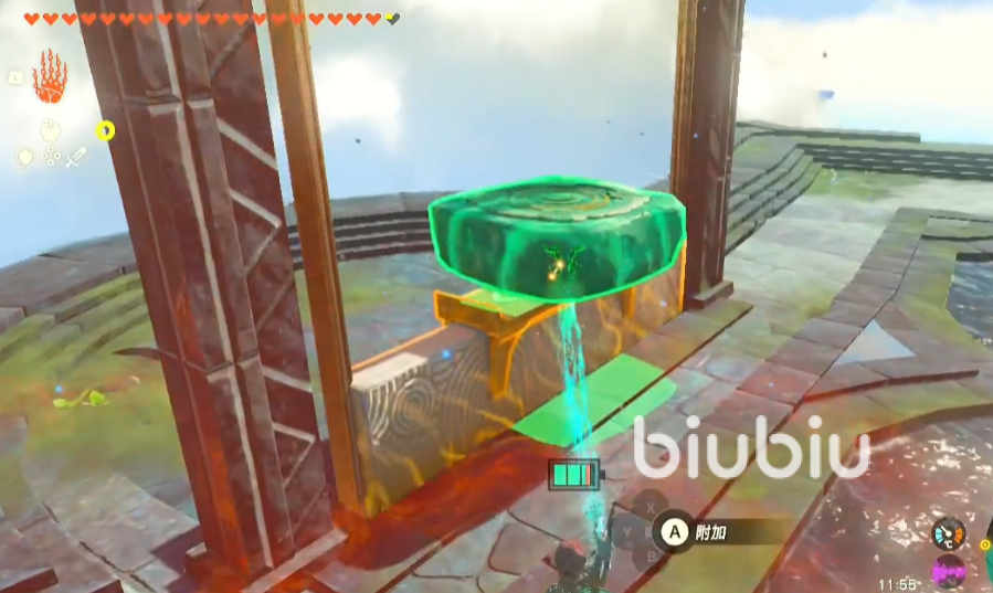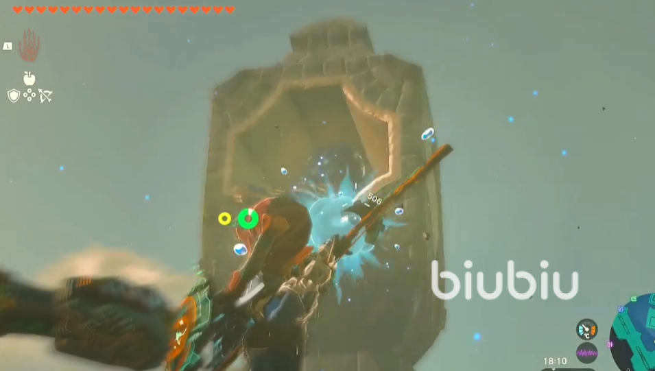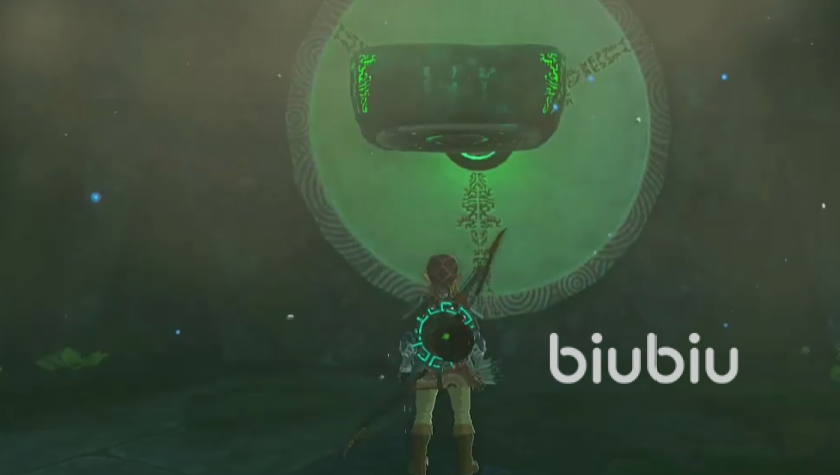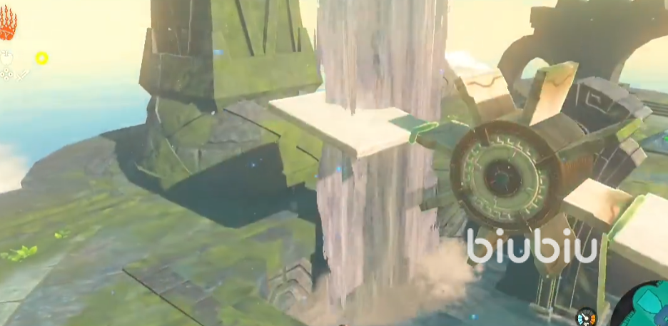 最后一处水车就在这个平台的右边,我们直接滑翔爬上去,可以看到一个一直转动的石柱,使用林克时间减速,用水箭攻击一下即可清除石柱里面的淤泥。再攻击一下里面的机关,即可清除脚下水潭里的水,水车也会显露在这里,攻击水车之后,原先挡在入口的淤泥就会尽数被清除。