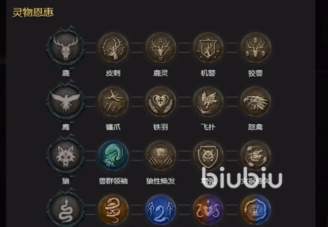 德鲁伊的职业专精也叫灵物恩惠,可以掉落独特的祭品,获得后可以交给第二章的NPC,以此来交换一些额外buff。德鲁伊总共有4种专精,分别是鹿、鹰、狼和蛇。每一种生物都会赋予玩家至少一种加成,上交的贡品越多,获得的加成就越多。需要玩家收集满某一种灵物的全部恩惠,才可以和对应的物种签下灵契,就可以解锁一个新的恩惠。不过,游戏设定是玩家只能装配一个契约。