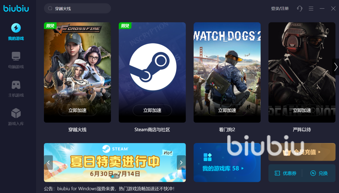 biubiu是专门针对网络优化提升而推出的多功能工具,cf游戏在运行的时候搭配它来使用效果是非常显著的,直接安装注册登录之后编辑穿越火线游戏名称,你会发现支持多个版本的加速服务。细心的伙伴可能会看到限免的标识,对的,这款游戏目前推出了限时免费加速的活动,对于其他加速器软件来说这样的活动还是非常少见的,喜欢国服的宝子们是不是瞬间就非常开心呢。
