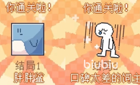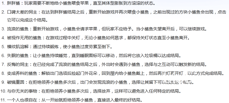 该游戏总共有11个结局(还有额外的两个最终结局),它们的触发的条件都各不相同,比如第一个结局需要不断地给小鲨鱼喂食苹果,直至其体型膨胀到方滚滚的状态。第二个则需要在达到一的结局之后重新开始游戏并再次喂食它,之前的方块形状的小鲨鱼就会出现,点击它以后就能达成下图所示的结局2。