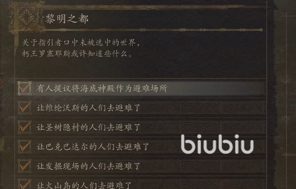 总的来说,黎明之都这个任务需要我们前往海底神殿创造避难场后,前往五个地点通过做不同的任务来劝说人们前往避难。另外在维纶沃斯遇到迪莎不肯走的情况,就直接把迪莎搬到斯温面前即可。当我们净化完所有光柱后,便会进入到最后大结局的动画了。