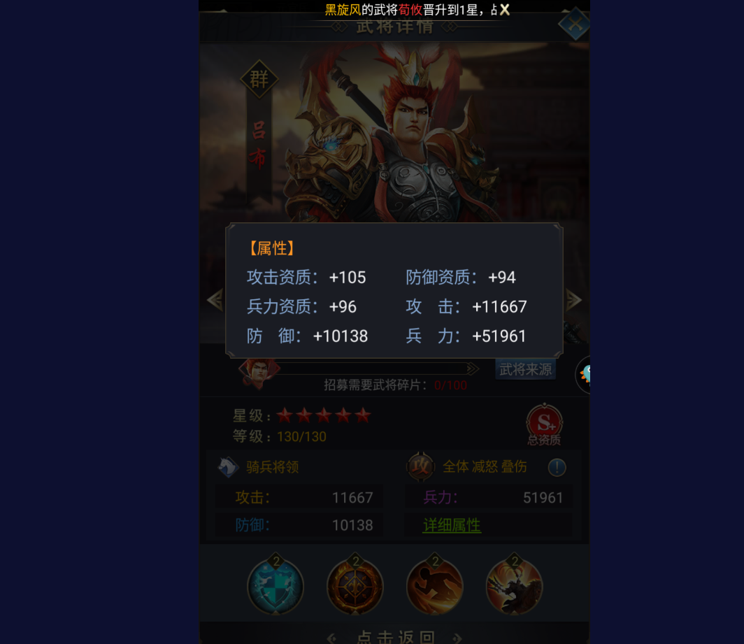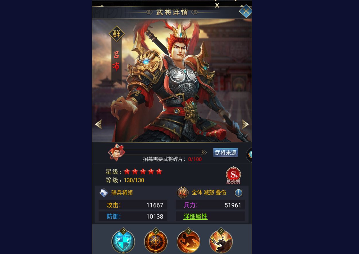 首先吕布是一名红色的武将,在这款游戏中武将有着非常明显的品阶划分,红色就是最好的等级,我们也能在图片上看到吕布是S+的资质了,星级也是五星。