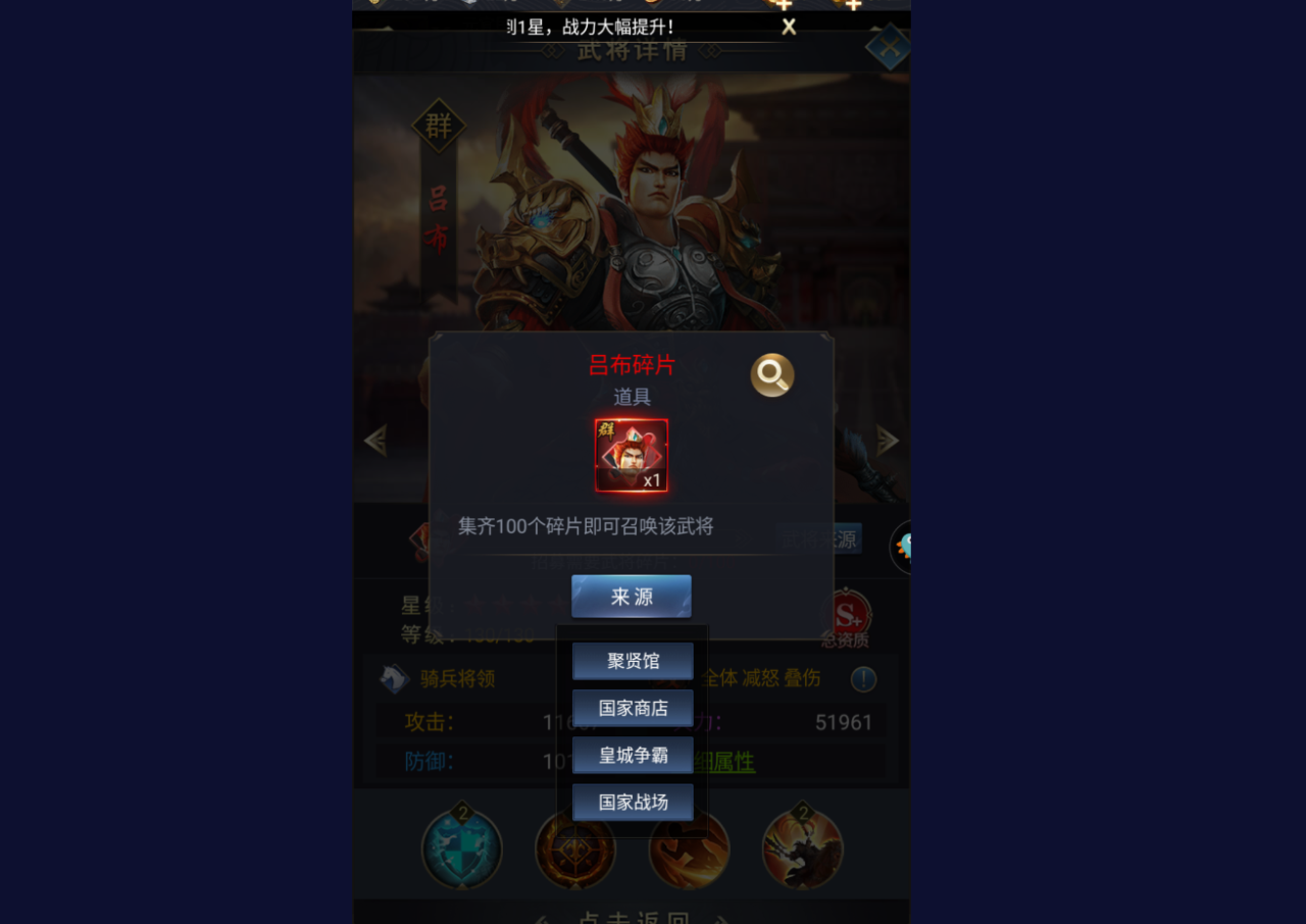 红色武将是不可以直接获得的,我们只能慢慢收集碎片来合成,而吕布的碎片来源一共有四个分别是聚贤馆、国家商店、皇城争霸和国家战场,小编觉得这四种方法大家都可以积极参加,毕竟红色武将都是可遇不可求的,如果在玩法中获得的话只能说大家的运气实在是太好了,小编也在努力的去抽这个武将。
