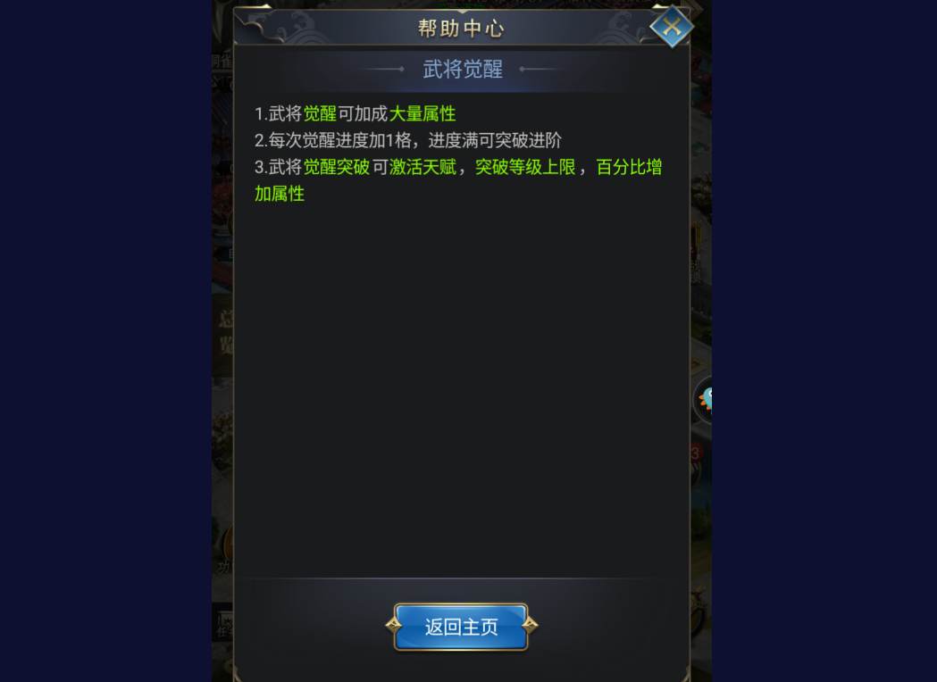 小编在给英雄进行培养的时候也找过武将觉醒的界面,可惜没有找到,目前只有武将的升级和升星这两个培养方式,所以小编就怀疑这个游戏是不是没有武将觉醒这个内容呢?但是当小编在帮助中心中找到关于武将觉醒的介绍时,小编就确定了这个游戏是有武将觉醒这个玩法的,可是无论小编怎么找上网怎么查,都在游戏中找不到。