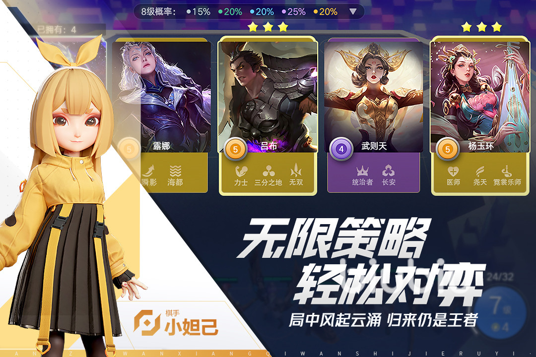 这款游戏的具体玩法就是通过对战从而获得一定量的金币,在通过金币购买不同羁绊的英雄,不同的羁绊都有着不同的效果,能够很大程度的增加英雄的战斗能力,从而在每一场玩家对局中获得胜利。