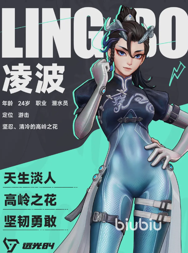 凌波作为一名酷酷的潜水员,能用创造水域的方式进行游击,她的第一个技能会在前方创造出水盾,水盾会自动向前移动抵达前方敌人的伤害,且会在路径上创造出能让自己移速更快水域,若处于潜龙状态下,水盾还会额外附带震撼效果,她的第二个技能会让自身变成潜龙,此时会持续消耗能量,但能获取减伤和移速的加成,该状态下脱离战斗,站在水域中能恢复一定生命值,她的大招是创造出湍流领域,在其中的敌人会遭受伤害、减速和音障效果,而在边缘的敌人会遭受减速和沉默。