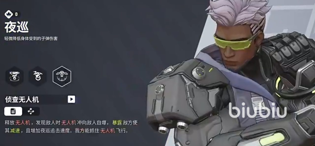 夜巡的第一个技能会放出巡查无人机朝着指定方向飞,若飞行期间发现敌人会直接向其冲去并自爆,所有遭受爆炸冲击的敌人除了会受伤外,还会暴露位置减移动速度,且夜巡自己若是追击暴露位置的敌人能得到加速,当无人机路过头顶时,我方所有成员都能拉着它飞行一段距离。