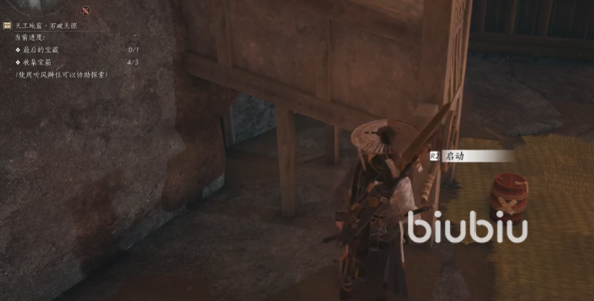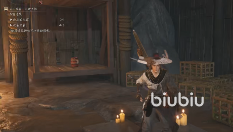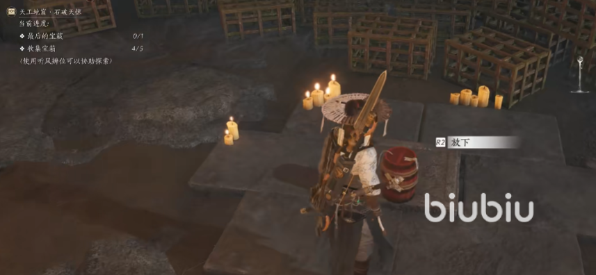 接着同样是启动机关,把炸药桶放在平台上,升起旁边的石门,进入梯子来到下层洞窟,下来后在右手边就可以看到一个宝箱。