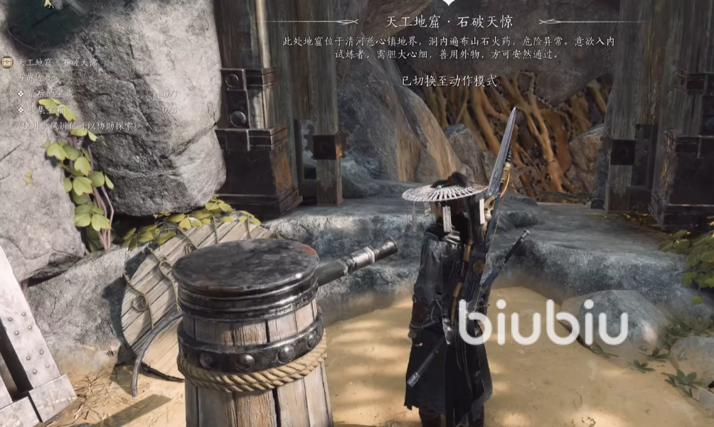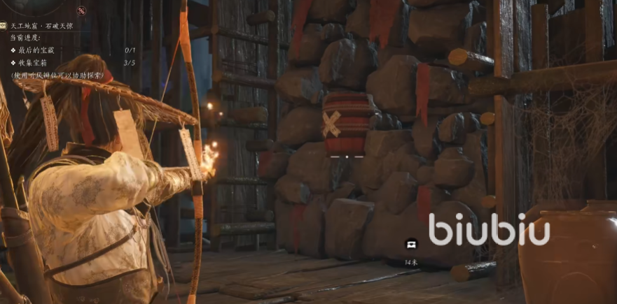 进入洞窟后,掰扯左边的机关拿到炸药桶,放到一旁的石壁附近,离远了用弓箭引爆,炸开后就能看到第一个宝箱。