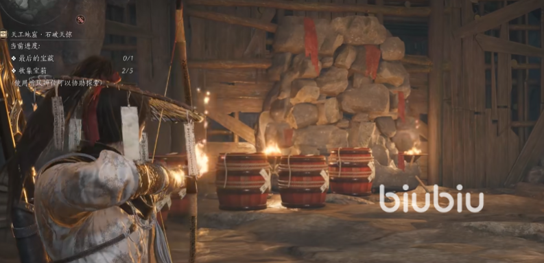 在有很多炸药桶的地方引爆炸药桶,炸开这里的石头后可以看到后面的宝箱。