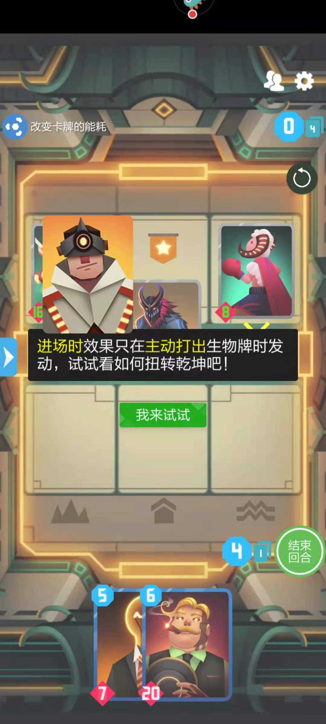 再经过训练后便可以开始进入解谜关,解谜关的难度比起训练教程的难度会增加不少,以第一个关卡为例,需要改变卡牌的能耗来取得战斗的胜利。这些解谜关卡都需要玩家去认真思考出牌的顺序和位置,不断尝试。