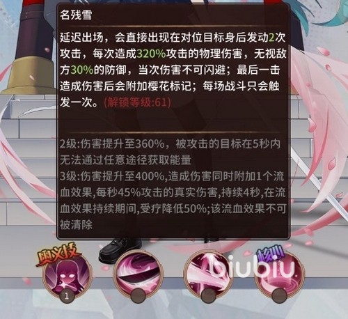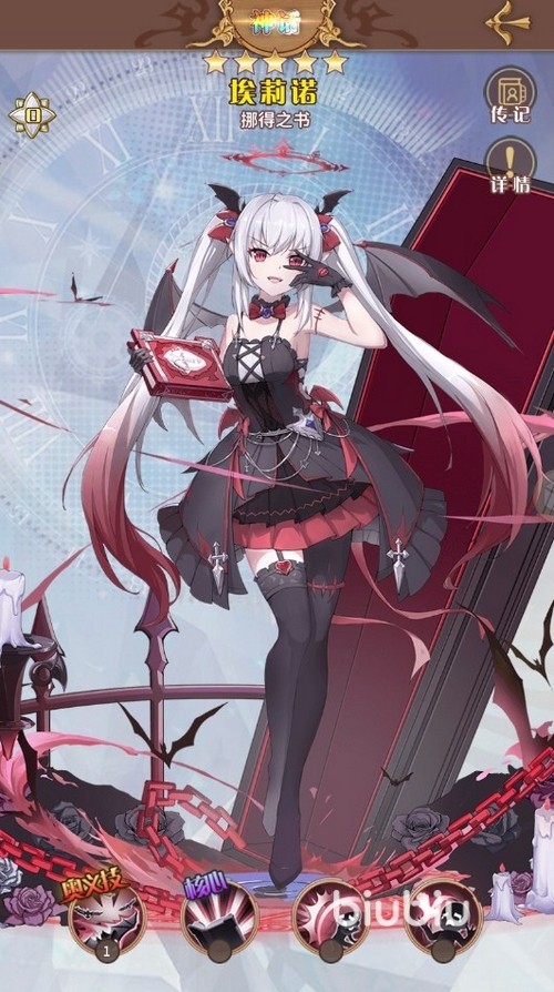 游戏里的她是非常全能的角色,不论伤害、生存都非常高,有了灵器之后还拥有斩杀效果,可以直接忽略敌人的复活与无敌技能,甚至尼德霍格的免死也能克制,这就非常的“imba”了,但因为是限定角色获取也是非常难的。