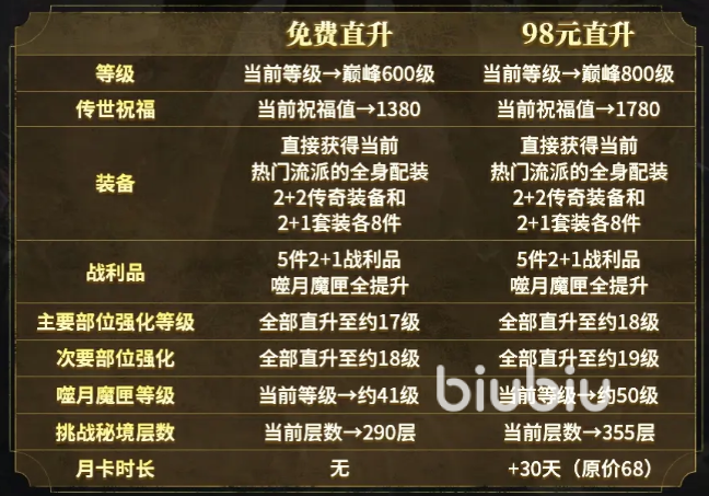 不仅有一键直升,更是能获赠配装的传奇装备、强力套装、还有珍惜的战利品。此外还有免费和98元两档的可供选择,给大家打造不同的直升方案。免费直升可以升到巅峰600级,98元直升则是800级。