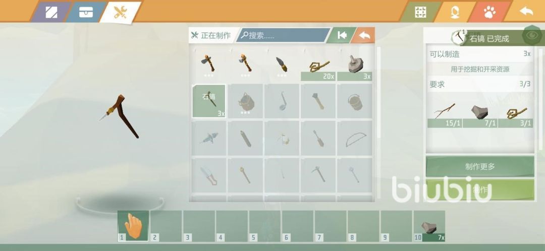 想要继续在这个岛屿上生存,首先需要完成的就是根据新手引导制作一把石斧,这个东西的作用非常广泛,不论是用来砍树还是捕猎都很不错。然后各位就需要在这个岛上收集一些比较基础的材料,就比如各种石块,木头和草。