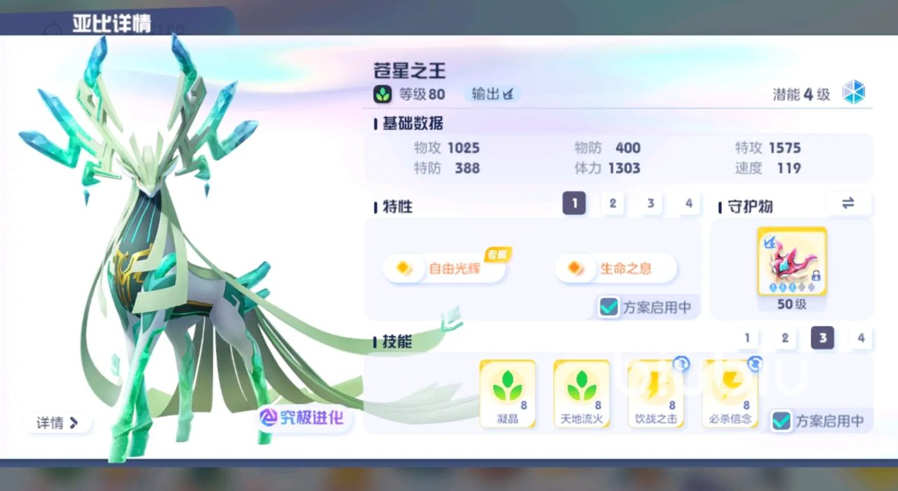 在制定攻略之前,我们需要做一个非常关键的步骤,那就是要去了解这只亚比的各项数据以及相应的效果。只有了解了这些基本的东西,我们才能够更好的制定出适合自己战略方针。首先我们需要知道的是苍星之王是一个鹿型的亚比,自身的系别为:草系,属于一只特攻输出类型的优秀亚比。然后它所具备的技能和特性我们也需要一一了解。