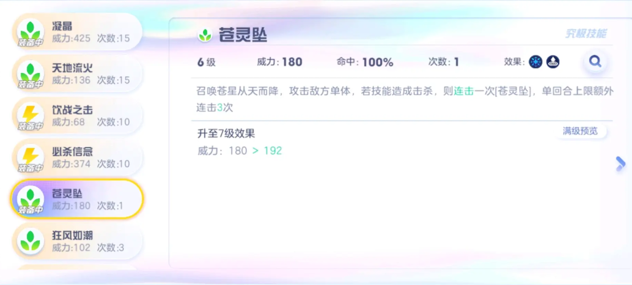 苍星之王的技能都主要围绕着“自由光辉”这个基本技能,而这个基本技能的效果的描述也很直白:就是说苍星之王在战斗的时候,释放该技能就能够做到每隔3回合可以出手两次。就比如说,如果我们的苍星之王做到在第1回合触发特性出手两次,那么之后在下一次触发该特性就是第4回合了,更直白的理解也就是当前回合+3 。知晓了这个以后,我们就可以利用这个特性组合出一堆的组合技能,分别都包括了:自由光辉加生命之息、自由光辉加猛兽猎手、自由光辉加究极打击还有就是自由光辉加上下马威。