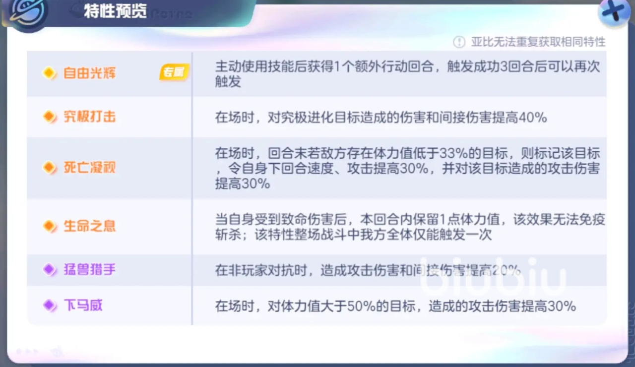 最后我们可以得出结论,苍星之王算的上是t1级别的优秀亚比了,不论是用于应对副本环境还是竞技场环境,都能够展现出优秀的效果,出场率也比较稳定,可以作为大家常用的亚比之一。因此苍星之王这个亚比还是比较推荐大家去积极获取的。顺带一提,苍星之王的获取方式也是比较的简单的,玩家们可以通过固定的up池子里靠抽奖获取。获取之后,大家要尽量将其培养到1阶甚至2阶,这样做的话,才能更好的发挥出它的究极特性的效果。如果实在是没能获取到的话,其实也有其他应对的方法,比如处理辉能异境的时候,可以练好自己的辅助,日常的副本可以用其他亚比代替。