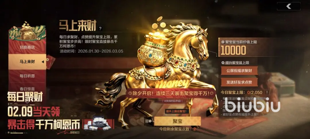 获取代币也很简单的,农场,山谷,电视台,要塞,击败地图中出现的神秘来客;还可参与每日祈愿活动,都能拿到大量代币。参与“马上来财”活动,每日求聚财,点赞提升聚宝价值上限,2月9日登录还能暴击聚宝,暴击概率获得千万科恩币。