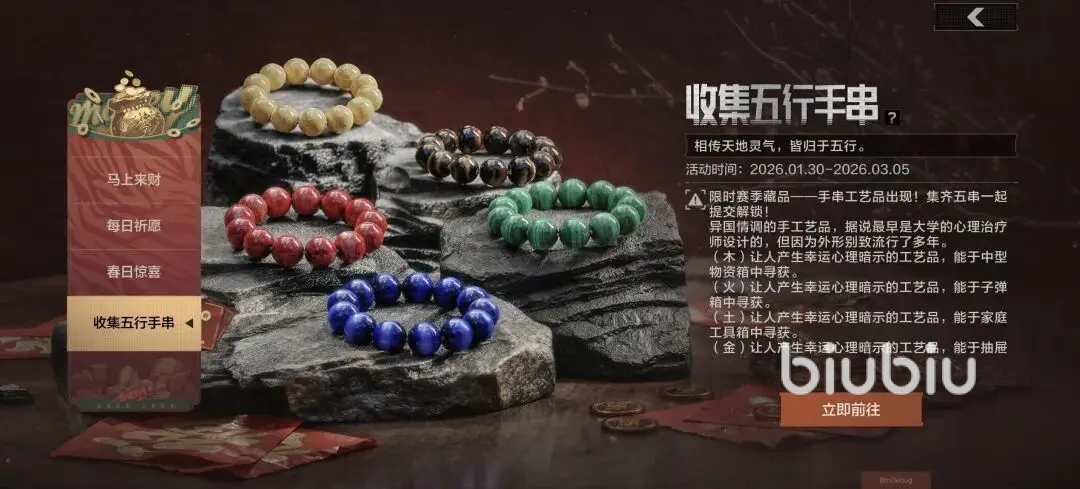 赛季限定藏品“五行手串”收集活动开始,可在局内指定容器中寻找散落的手串,一共有五种颜色,集齐整套提交,就能解锁特殊档案物资;2月6日开始,局内有概率出现惊喜空投和贺岁红包;