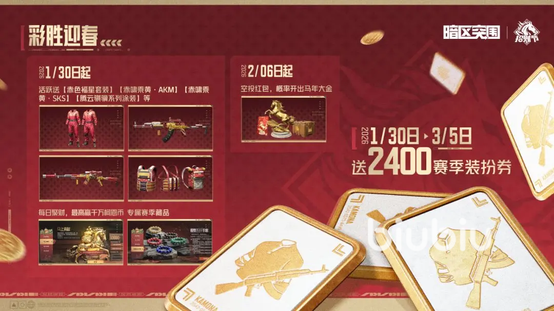 1月30日开始,上暗完成每周任务就能获得积分,最高能拿到2400赛季装扮券;其次就是新春限定外观免费领,可参与活动,收集“马上发财”代币,能免费兑换春日主题活动“赤色·福星”套装,“赤霄·乘黄AKM”,还有一套SKS,还有腾云骐骥系列涂装,这些都是限定奖励。