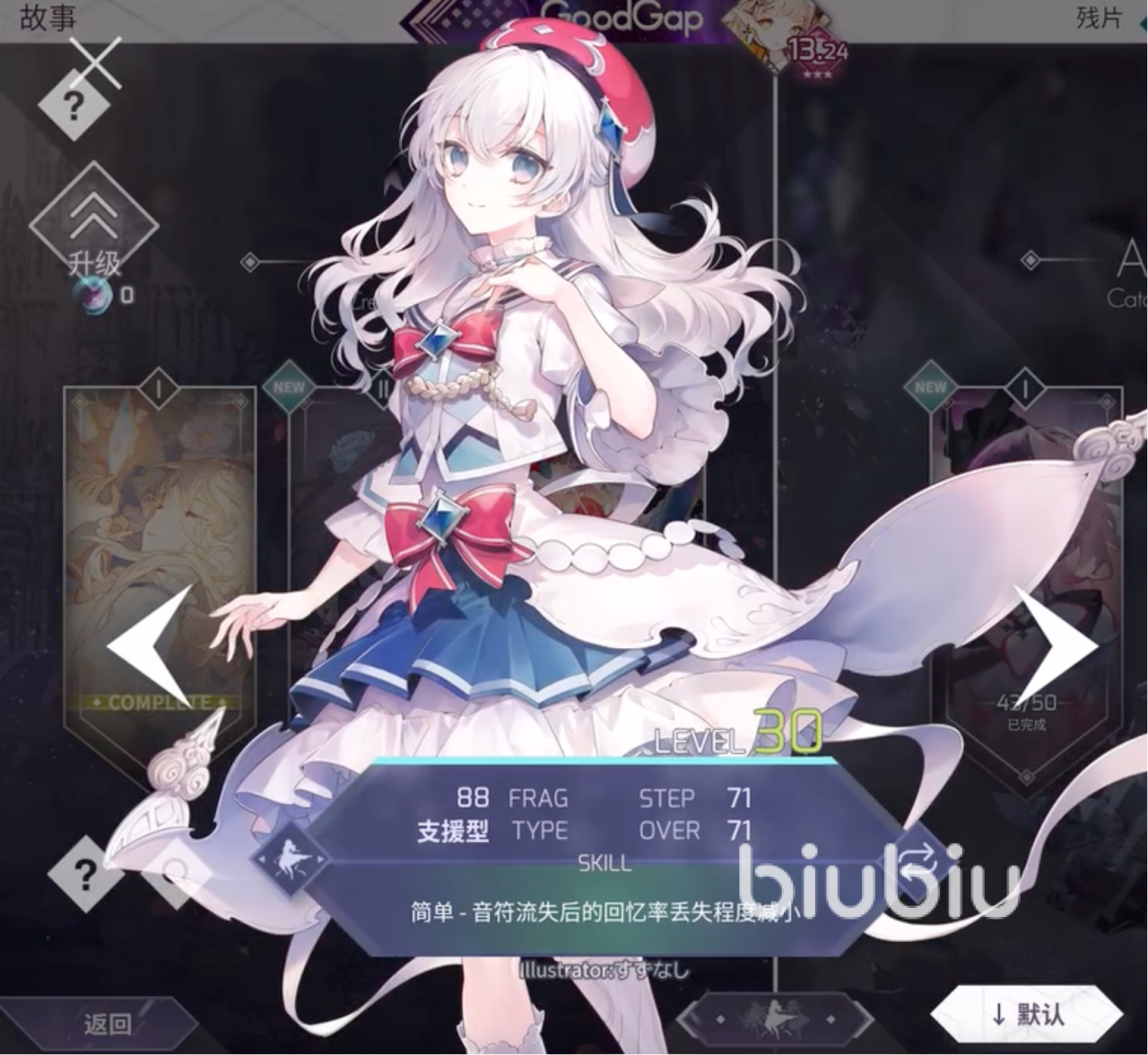 缪是许多玩家喜爱的“女儿”,其技能为“增加Track Lost容错率”,也就是在Miss较多的情况下依然能保住一定的成绩分数,适合练习高难图或挑战失误率较高的谱面。是练习进阶谱面的好帮手,对喜欢尝试高难挑战但又怕影响成绩的玩家来说非常友好。