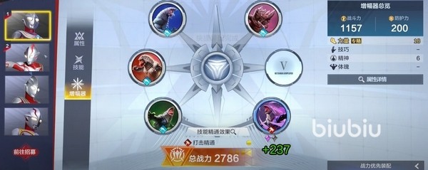 作为一款网游,它也是有养成要素的,有属性提升,有等级共享,还有通过开启奥特卡包等方式获得卡片来为奥特曼搭配合适的增幅器,来强化其在某一方面的能力,这部分也会是游戏战斗策略的重要一环。