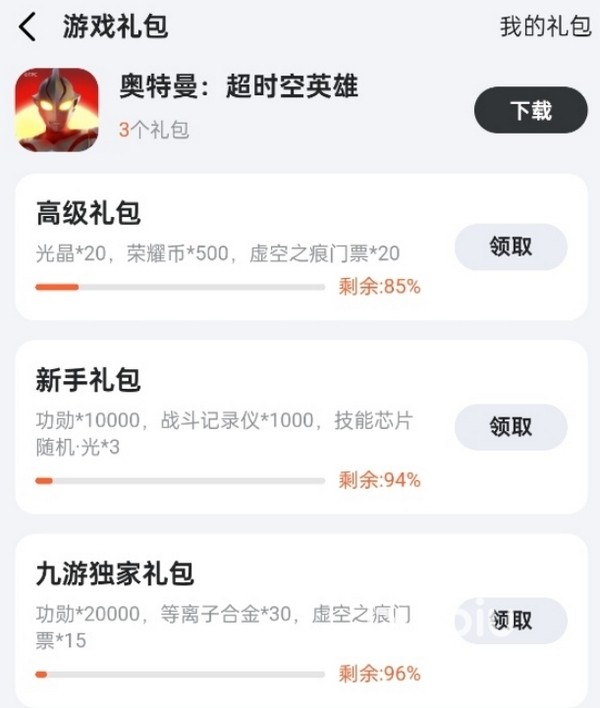 除了通用礼包码之外,玩家如果是通过九游APP下载并安装该游戏,还可以在九游平台内获得专属福利礼包。平台提供的新手礼包、高级礼包以及九游独家礼包,目前依然有大量余量,礼包内容包括光晶、荣耀币、功勋、战斗记录仪、技能芯片等资源,帮助玩家快速提升角色战斗力和游戏进度。
