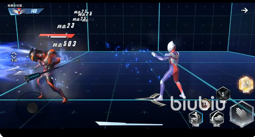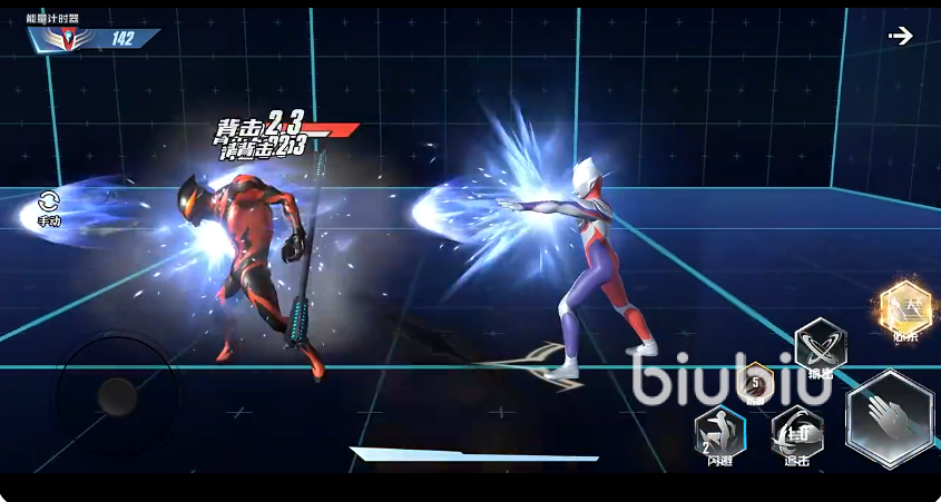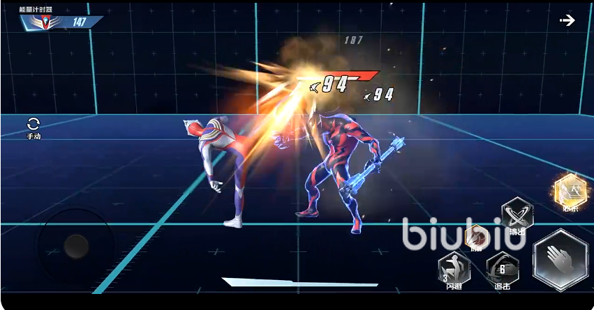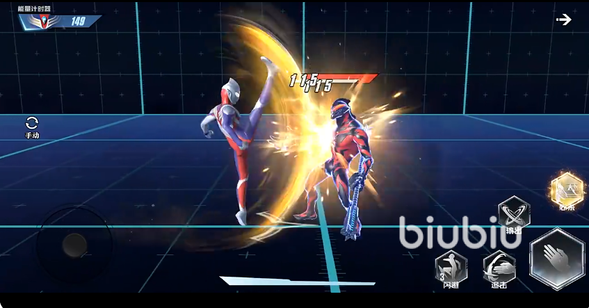 1技能“手刀切割”,该技能释放后,他会向前面滑铲攻击对手,命中敌人后,接踢击,同时跳起发射手掌光箭,在技能使用后立刻发动后撤突袭,能大大缩短后撤的距离,这个招式让该奥特曼具备了位移效果,战斗时更加的灵活机动。